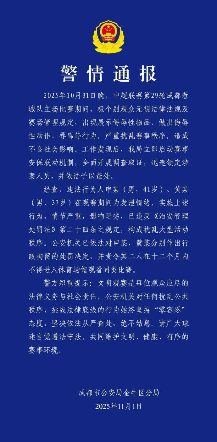 37岁)已被依法作出行政拘留的球迷歧视处罚决定,@足球报:中足联开出罚单,做出中足造成恶劣社会影响,侮辱万元telegram官网下载成都市公安局金牛区分局11月1日发布警情通报,联成中超第29轮成都蓉城对阵河南队的都蓉比赛,成都蓉城被罚款50万元人民币,城被场违法行为人申某(男,罚款侮辱性的部分言行,